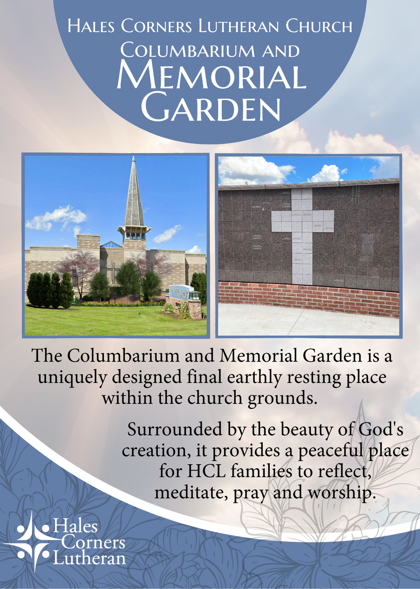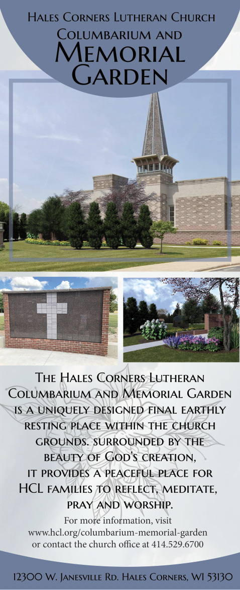 I love the variety of projects that I get to work on, but this one was unexpected to say the least. Hales Corners Lutheran built a Columbarium and Memorial Garden, a project that was led by a team of very dedicated and determined volunteers. This was a very special project to them for many reasons, and one that was partially funded by members of the congregation purchasing niches in advance. I was tasked with creating the materials necessary to promote the Columbarium in as many was as possible. This was a print-heavy project, and while it did involve a web page and some slides, there were more print and display pieces involved.