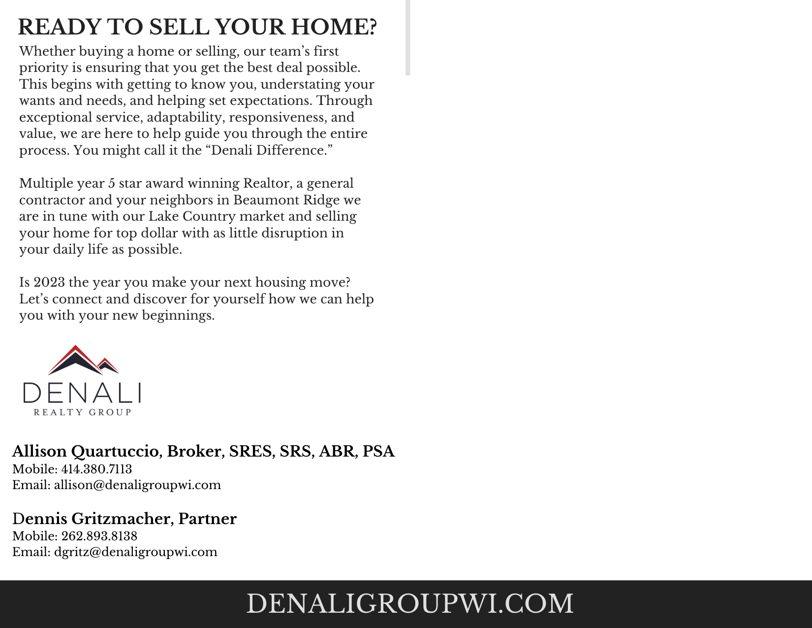 Realizing they had sold homes all over Southeastern Wisconsin, but never any in their own neighborhood, Denali asked me to create a postcard specifically targeted to their neighbors. My goal was to create a friendly design with content that would encourage future clients to reach out to their friendly neighborhood Real Estate Agents!