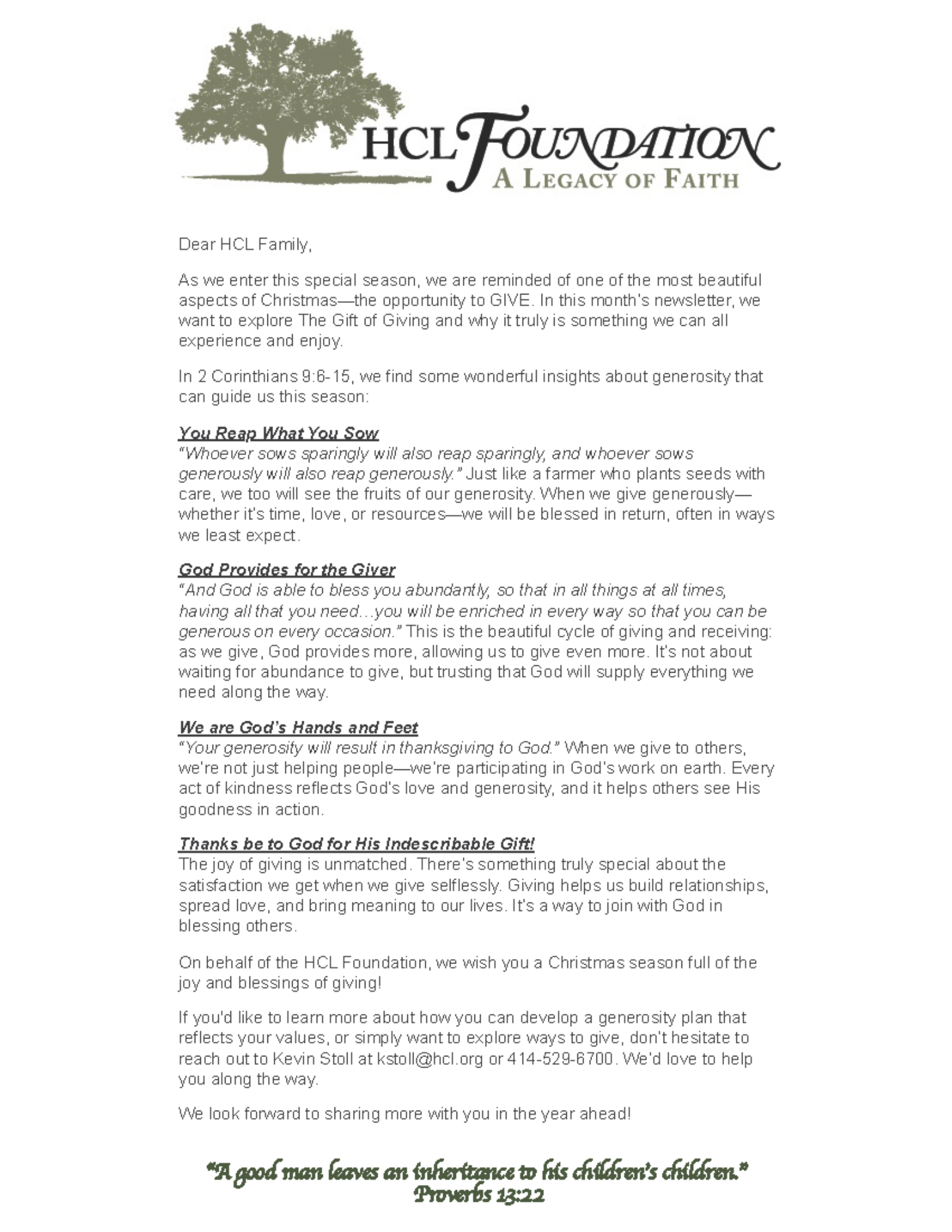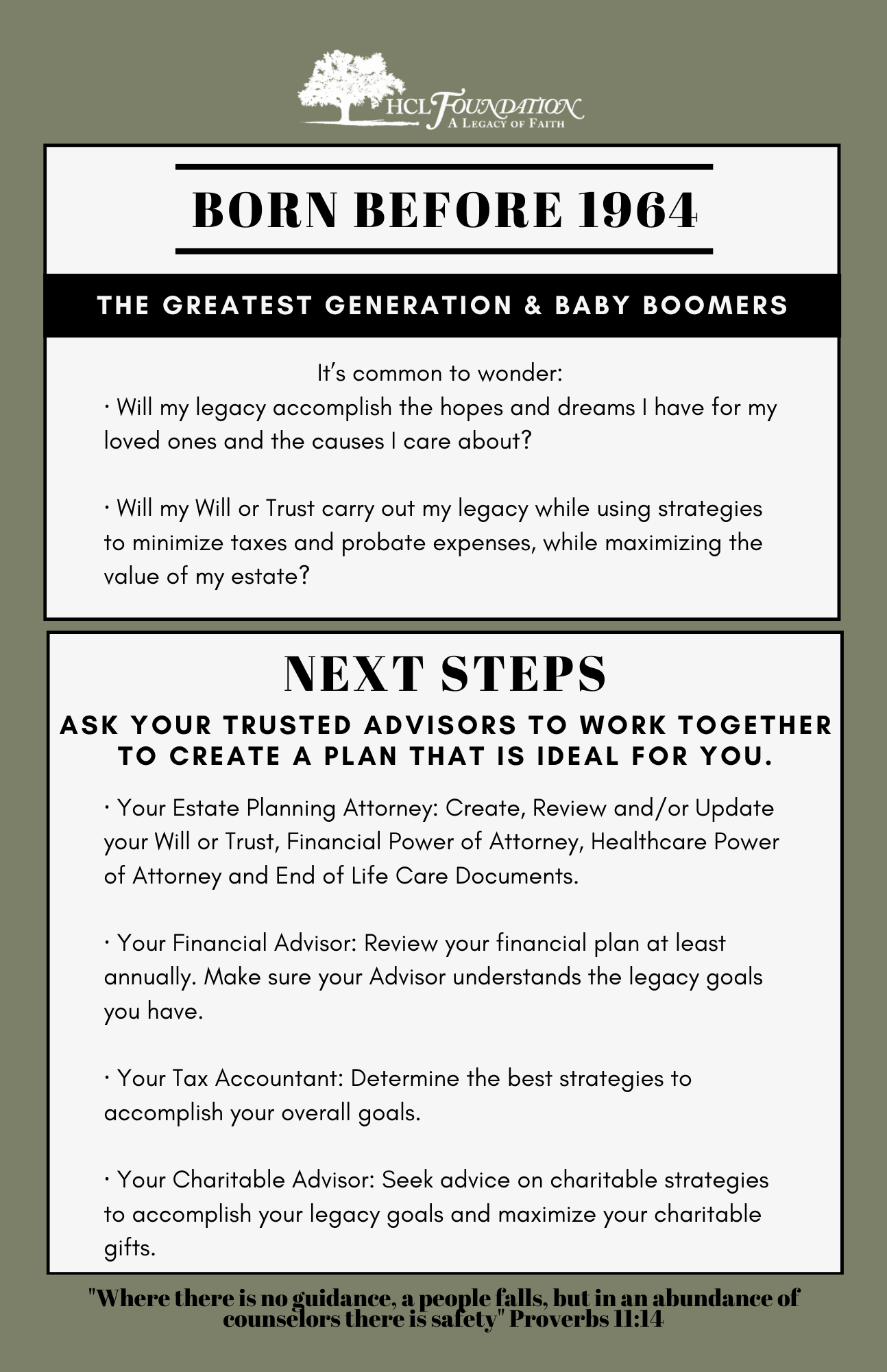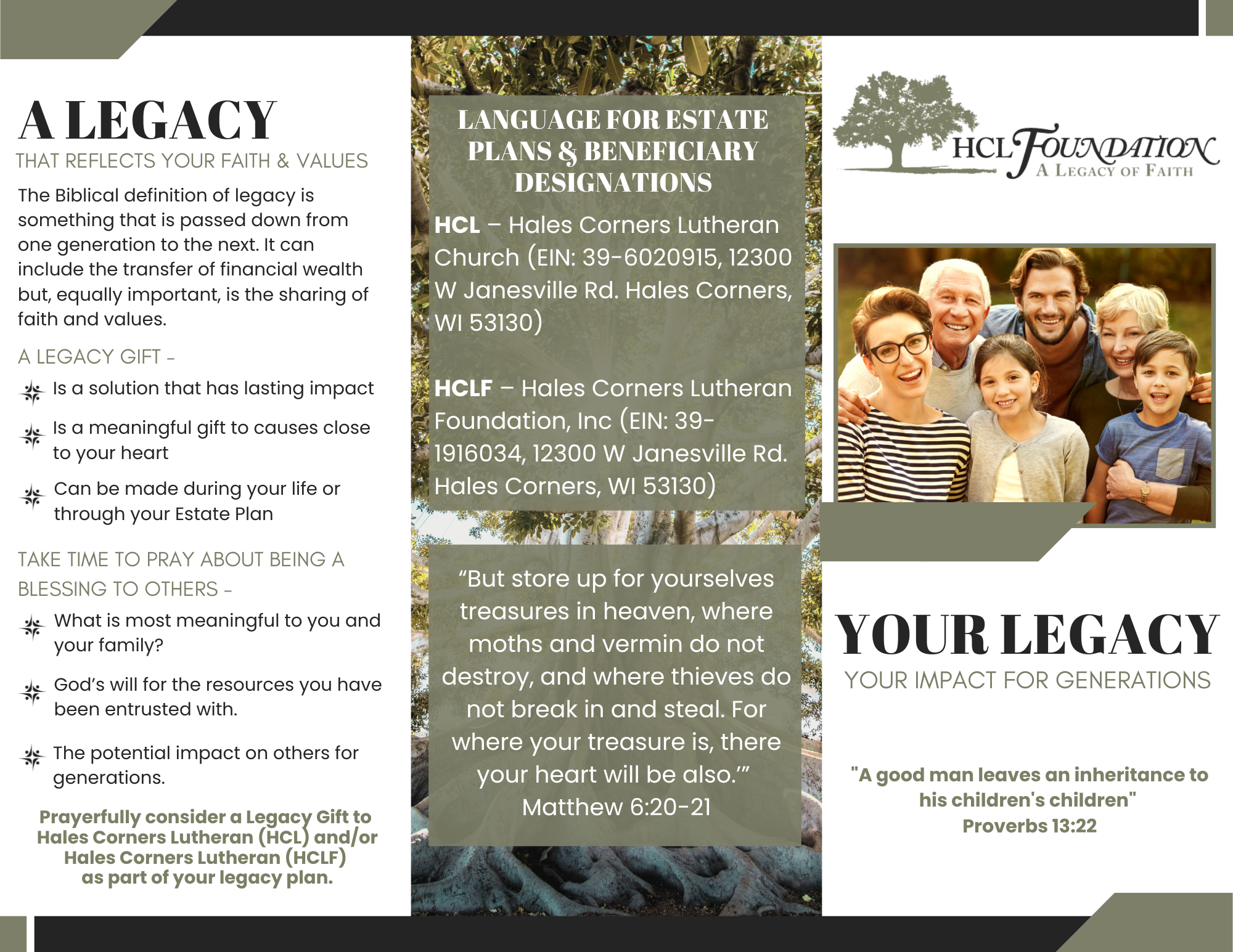 The HCL Foundation is a non-profit organization that was created to support Hales Corners Lutheran as well as provide financial guidance to the members of the church. I met with a few of the Foundation’s members to discuss a refresh of their materials, as well as strategies to re-introduce the congregation to the Foundation. They wanted to not only encourage generous giving and stewardship in the present, but also guide members to the right resources to give them them a successful financial future be able to leave a legacy of generational wealth behind them.
